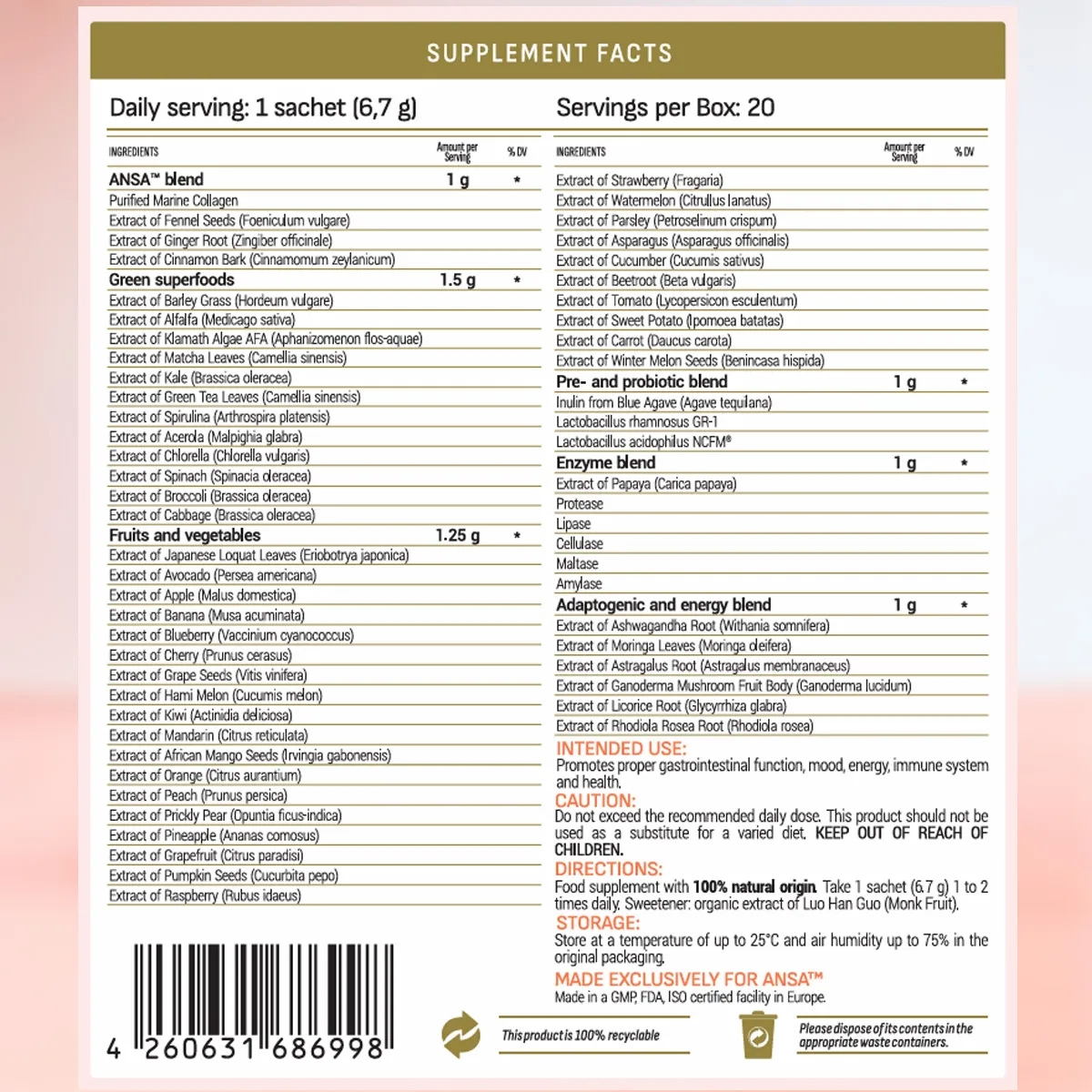 59 корисних састојака хране, укључујући: колаген, ацерола, спирулина, пробиотици, пребиотици, ензими, влакна и 45 врста поврћа и воћа